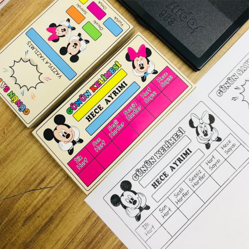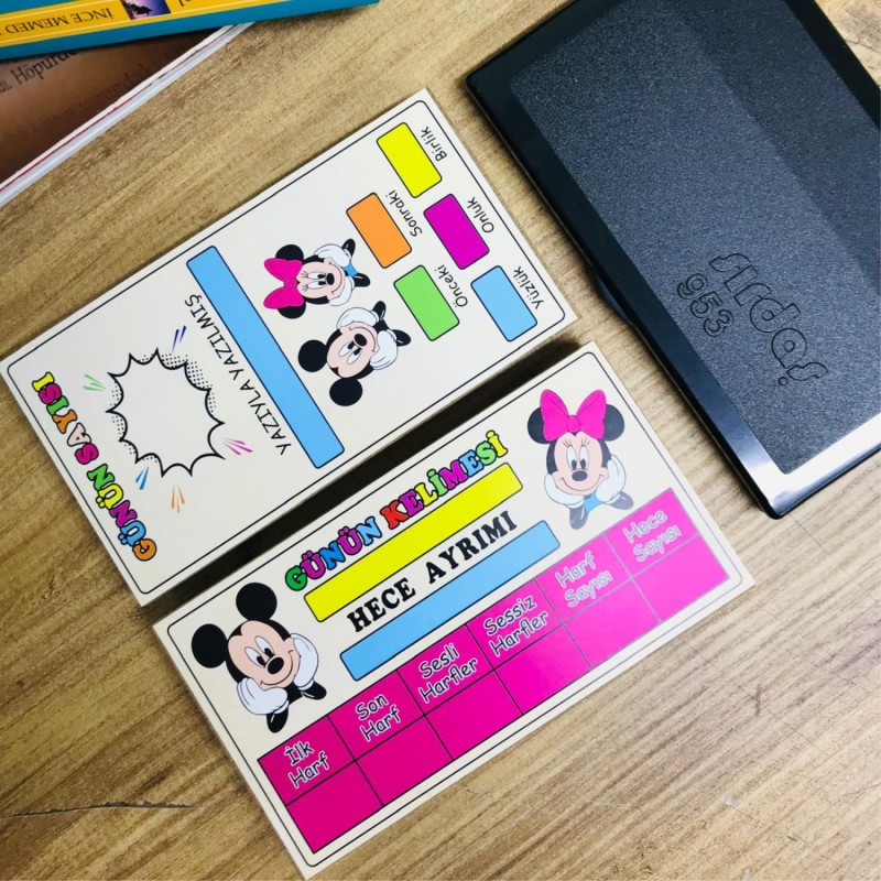 Günün Kelimesi ve Günün Sayısı eğitici mühürü, öğrencilerin hem dil hem de matematik becerilerini geliştirmeyi amaçlayan pratik ve eğlenceli bir öğretim materyalidir. Çalışma kağıtlarına basıldığında; kelime analizi bölümleri sayesinde öğrenciler heceleme, harf türleri ve kelime yapısını öğrenirken, sayı bölümü ile sayıları inceleme, basamak değeri ve sayı farkındalığı becerilerini pekiştirir. Renkli ve dikkat çekici tasarımı öğrenmeyi keyifli hale getirirken, tekrar kullanılabilir yapısı uzun süreli kullanım sağlar.